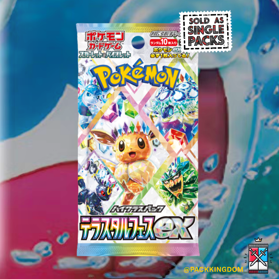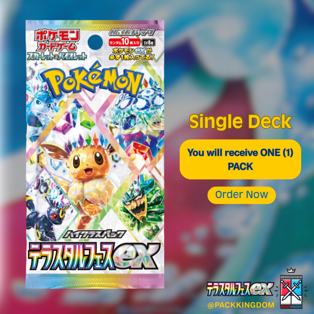 This listing is for one (1) single Pokémon TCG: Scarlet & Violet—Eeveelutions Terastal Festival ex High-Class Booster Pack. Each pack contains 10 authentic Japanese cards with a guaranteed Pokémon ex, offering a thrilling chance to discover Stellar Tera Eeveelutions and stunning Secret Rares to expand your collection.