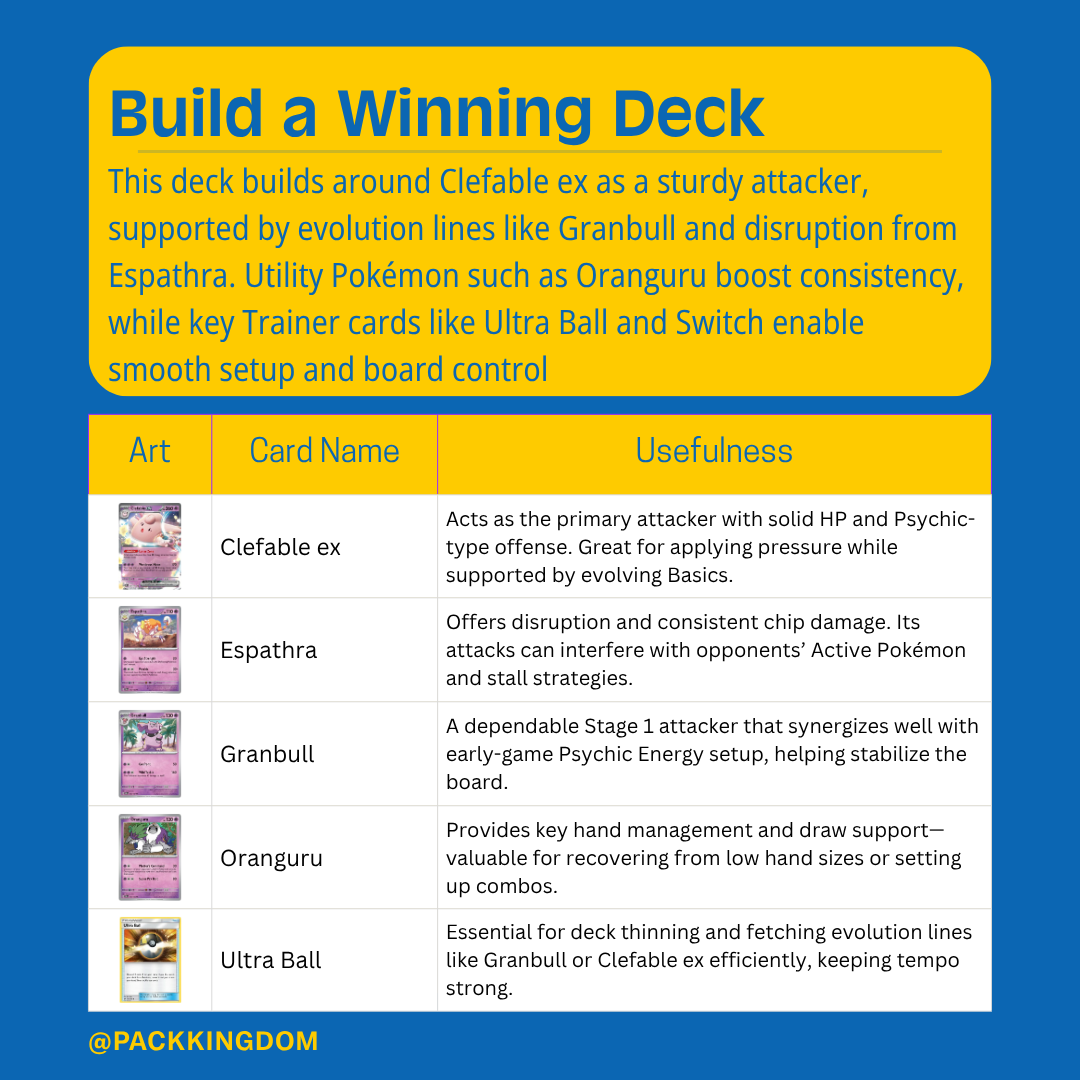 - Powerful Pokémon ex: The deck is built around the powerful Clefable ex, a high-HP Pokémon with unique attacks.