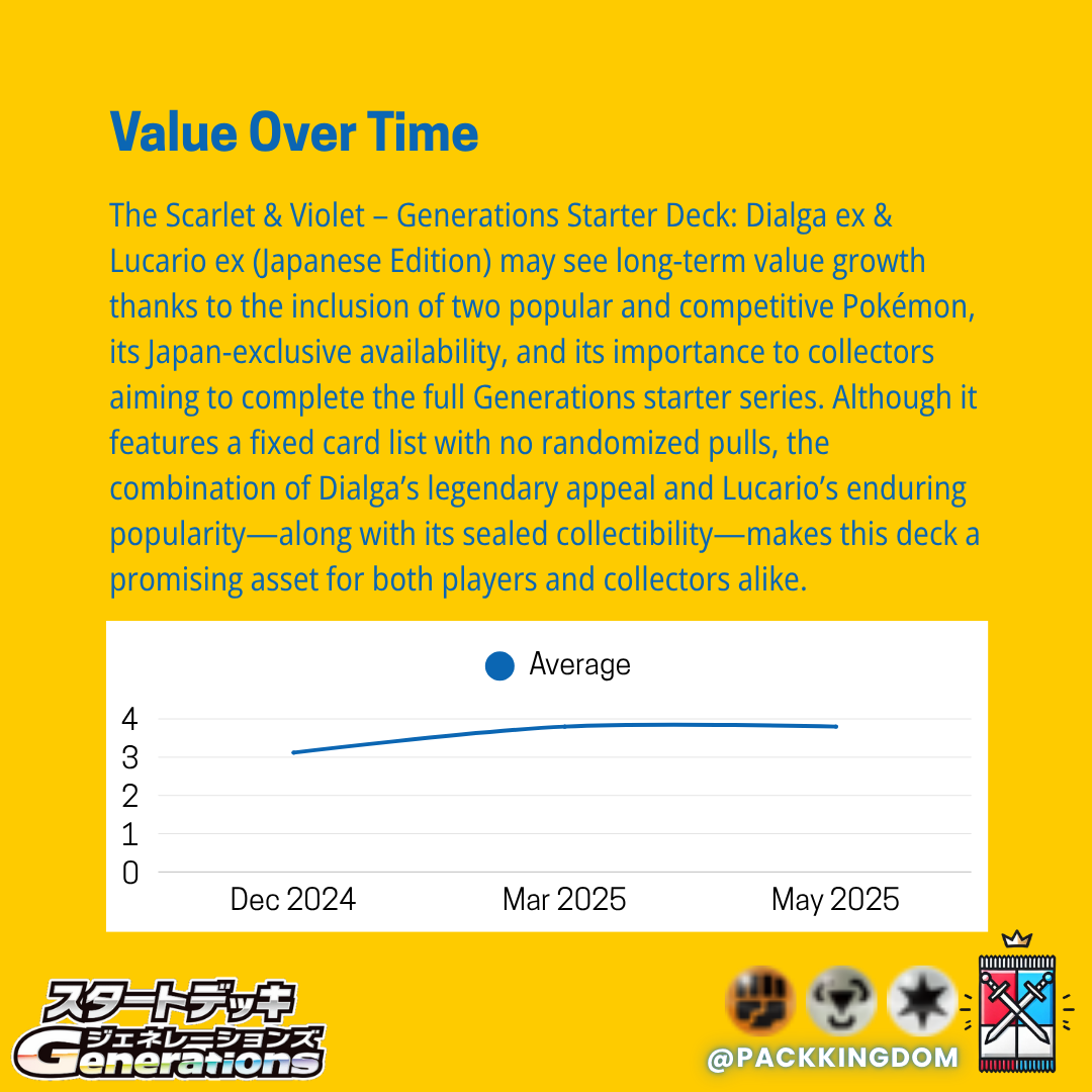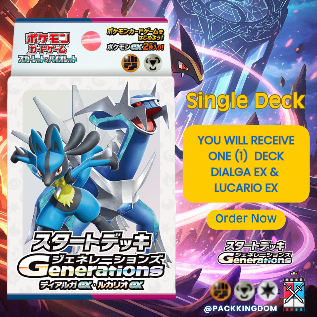 This listing is for one (1) single Pokémon TCG: Scarlet & Violet – Generations Starter Deck: Dialga ex & Lucario ex (Japanese Edition). This ready-to-play 60-card deck features the powerful Dialga ex and Lucario ex, perfect for new players to dive into strategic battles in the Pokémon TCG.