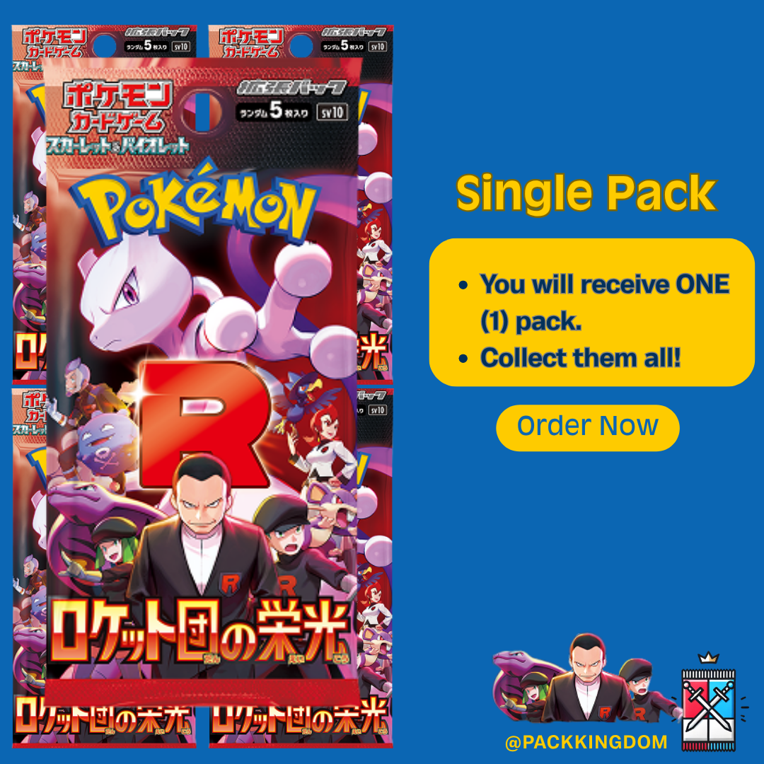 This listing is for one (1) single Pokémon TCG Scarlet & Violet-Glory of Team Rocket Japanese Booster Pack. Each pack contains a random assortment of 5 authentic Japanese Pokémon cards, offering a thrilling chance to expand your collection.