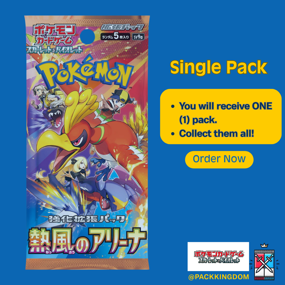 This listing is for one (1) single Pokémon Heat Wave Arena (sv9a) Japanese Booster Pack. Each pack contains 5 authentic Japanese Pokémon cards, offering a thrilling chance to discover powerful Trainer’s Pokémon like Cynthia’s Garchomp ex and stunning Secret Rares to expand your collection.