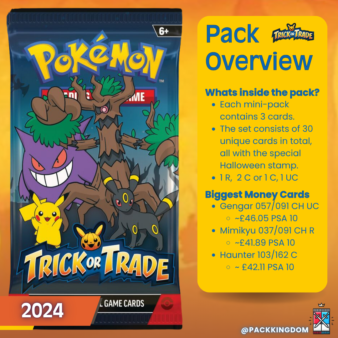 Unleash Halloween fun with the Pokémon Trick or Trade Halloween Collector’s Bundle (2022, 2023, 2024)! Get single mini-booster packs from each year, featuring 3 cards with a special Pikachu pumpkin stamp and guaranteed holos, including the new 2024 Cosmos holofoil. Perfect for collectors and trick-or-treaters!
